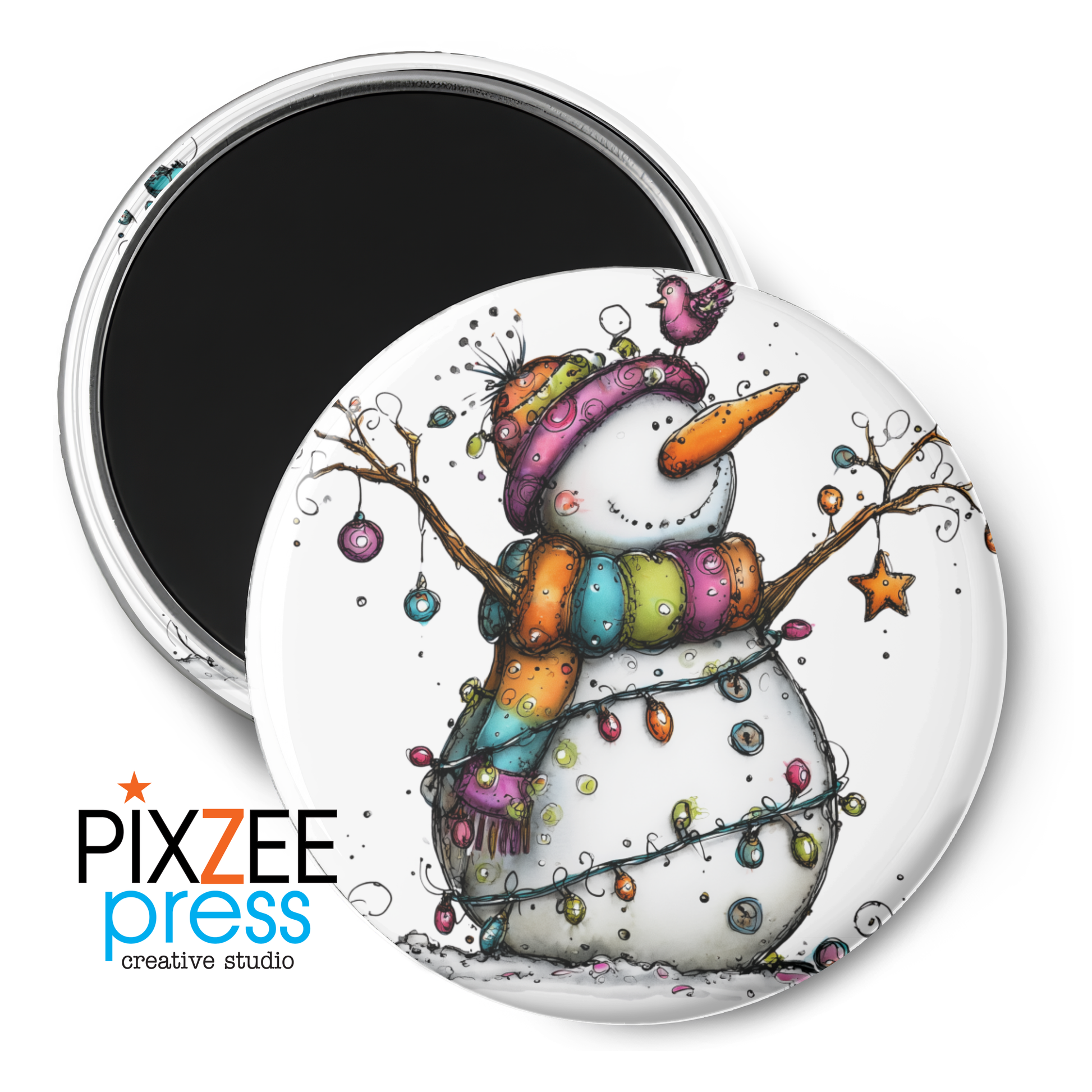 This winter magnet stars a snowman decked out in holiday lights, ornamented twig arms, and a pink bird perched proudly on top. A whimsical gift for magnet collectors, Secret Santa swaps, and anyone who decorates down to the fridge.