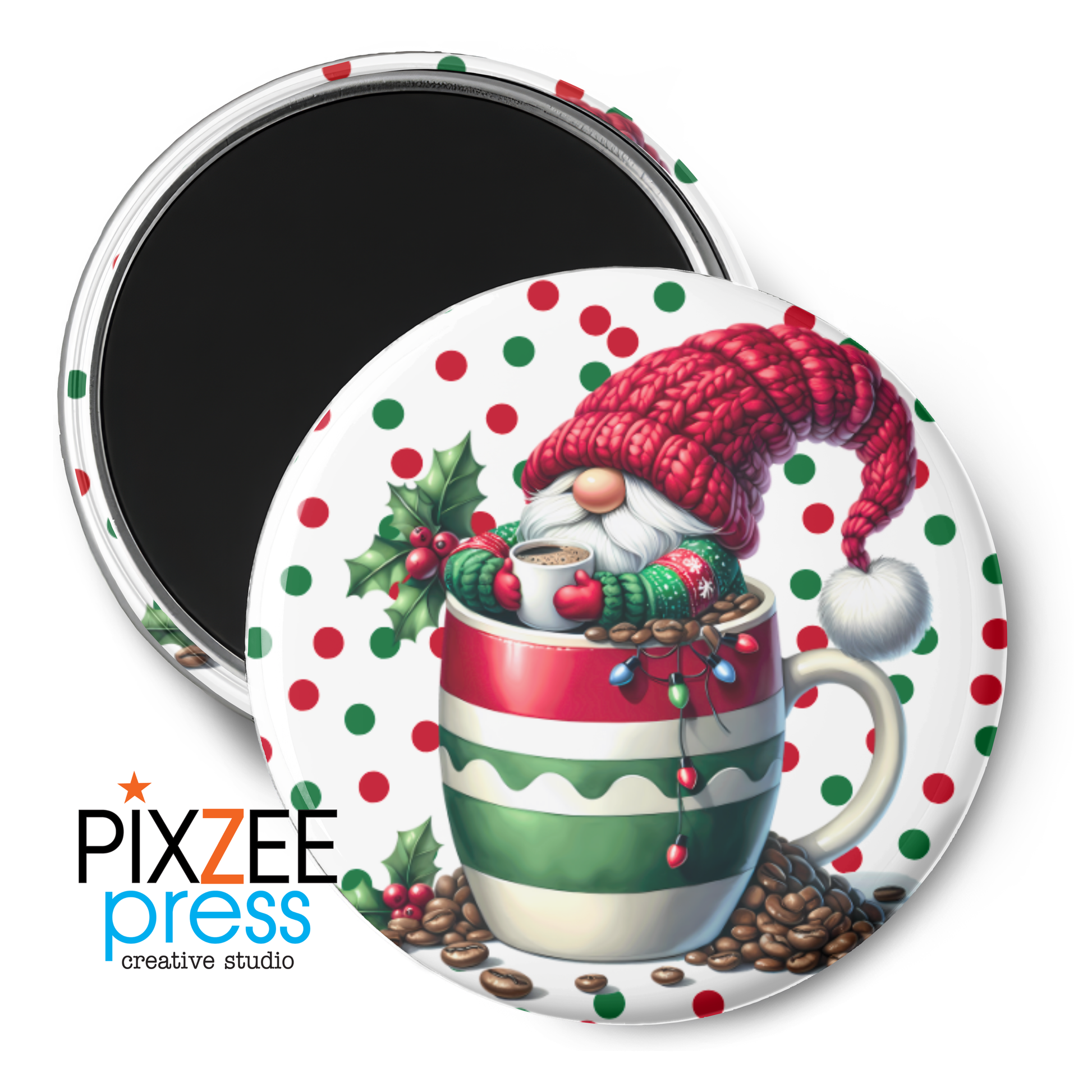 Snowbert McFluff is cozied up in a coffee cup, surrounded by a glorious scatter of beans. With his festive hat and caffeine-fueled cheer, this holiday gnome is here to perk up your winter decor. Printed on a 2.25-inch round novelty magnet, he’s perfect for coffee lovers, gnome collectors, and anyone who runs on seasonal brew and joy.
